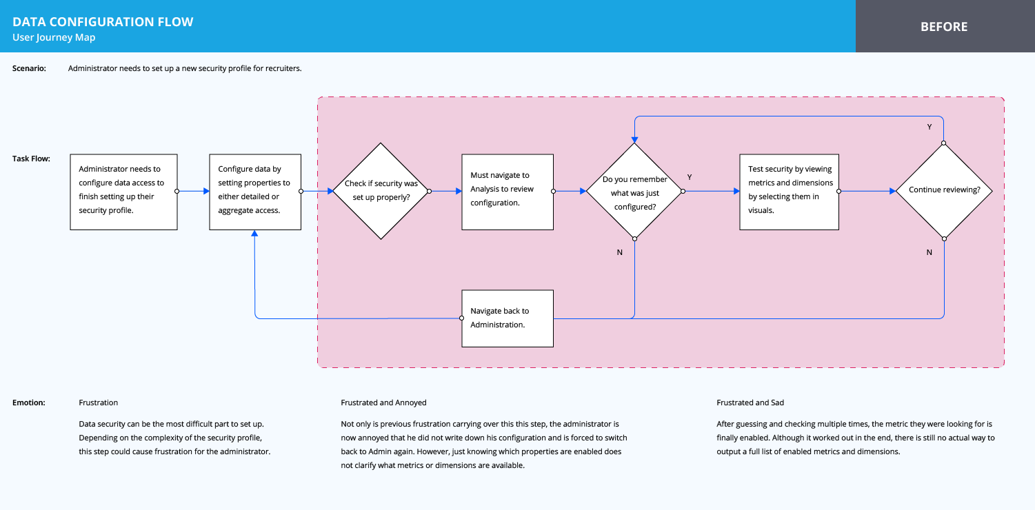 Doing a bit of research, I discovered that Visier's platform actually has a very accurate representation of what metrics and dimensions that are available depending on the data loaded, but does not output this information anywhere. With this information, I proposed a review workflow that assists administrators as they configure security.