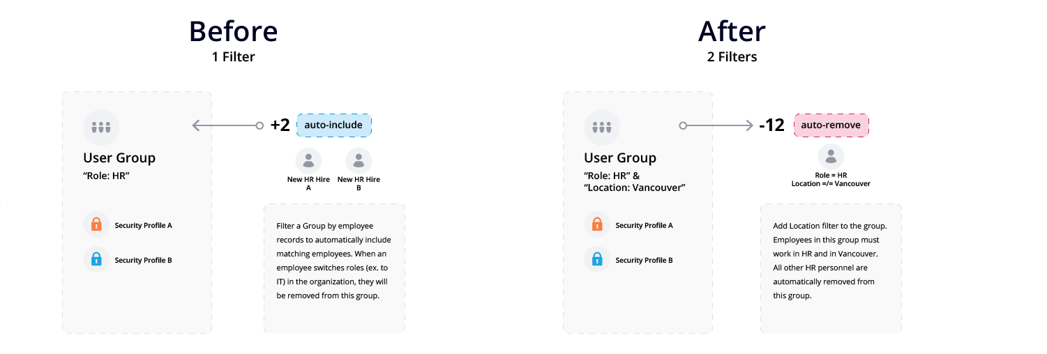 Instead of creating a group manually for all employees who work in HR at the Vancouver office, administrators are able to select filters based on the employee record, such as the employee role as HR and employee location in Vancouver, to auto-generate a user group that matches those records.