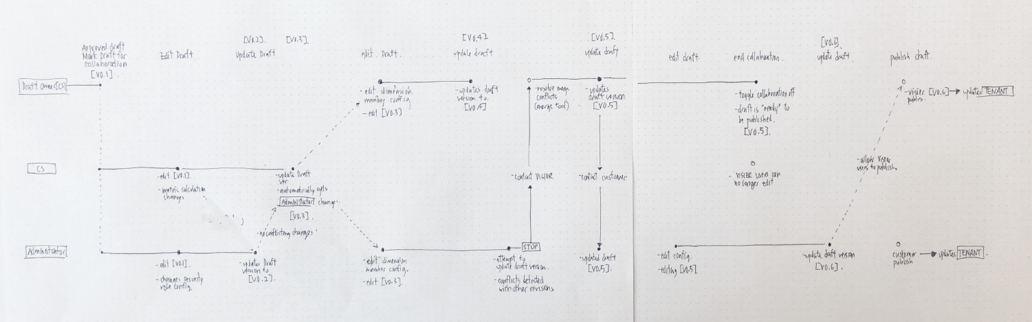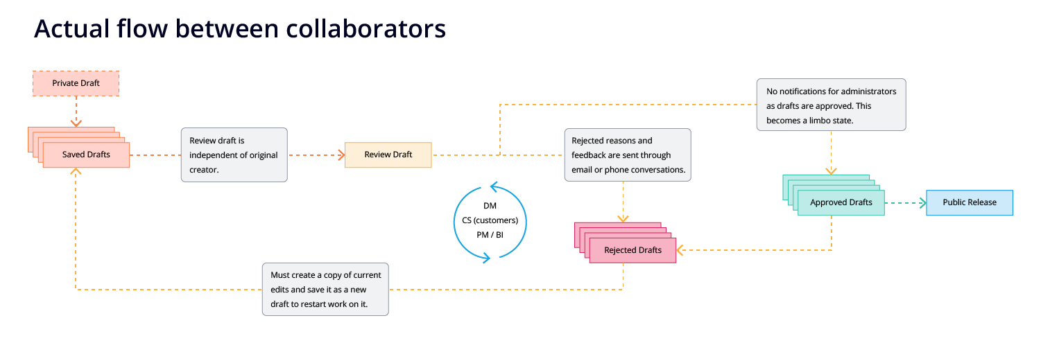 From the customer interactions, to cross-team interactions, my team and I discovered that there were multiple touchpoints within the workflow that were meant to be collaborative. However, because the system was broken, it was inefficient and error prone, often resulting in breaking changes or accidentally erasing days worth of work.