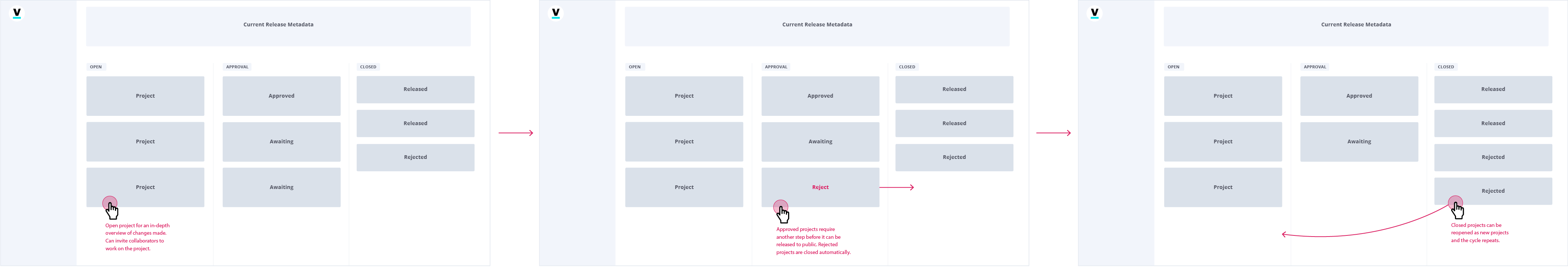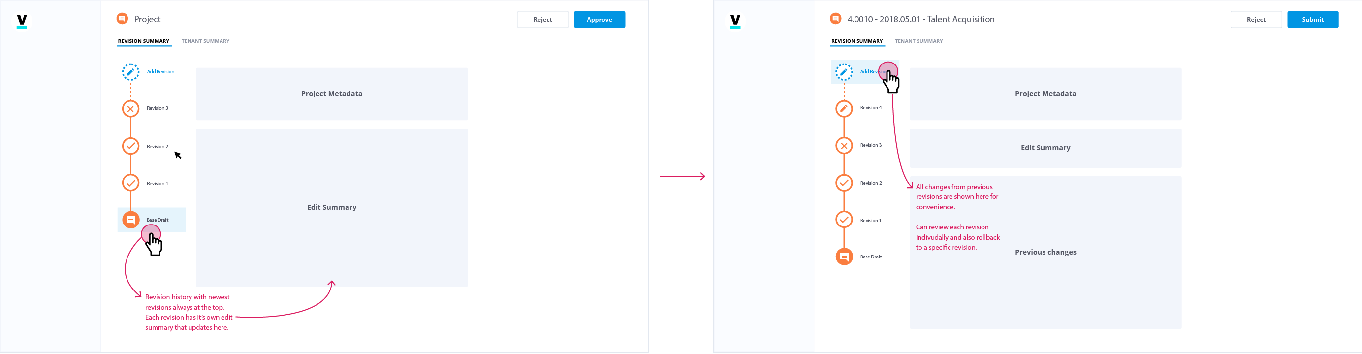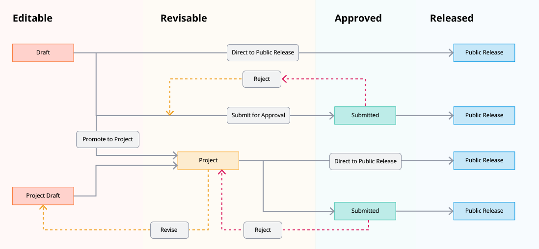 After identifying the core problems needed to be addressed, I reframed my initial goal to improve the current system, and reimagined it completely. I proposed a Project-based construct focusing on collaboration and risk management, dropping the need for multiple draft states, and effectively redefining our versioning system as Lifecycle Management.